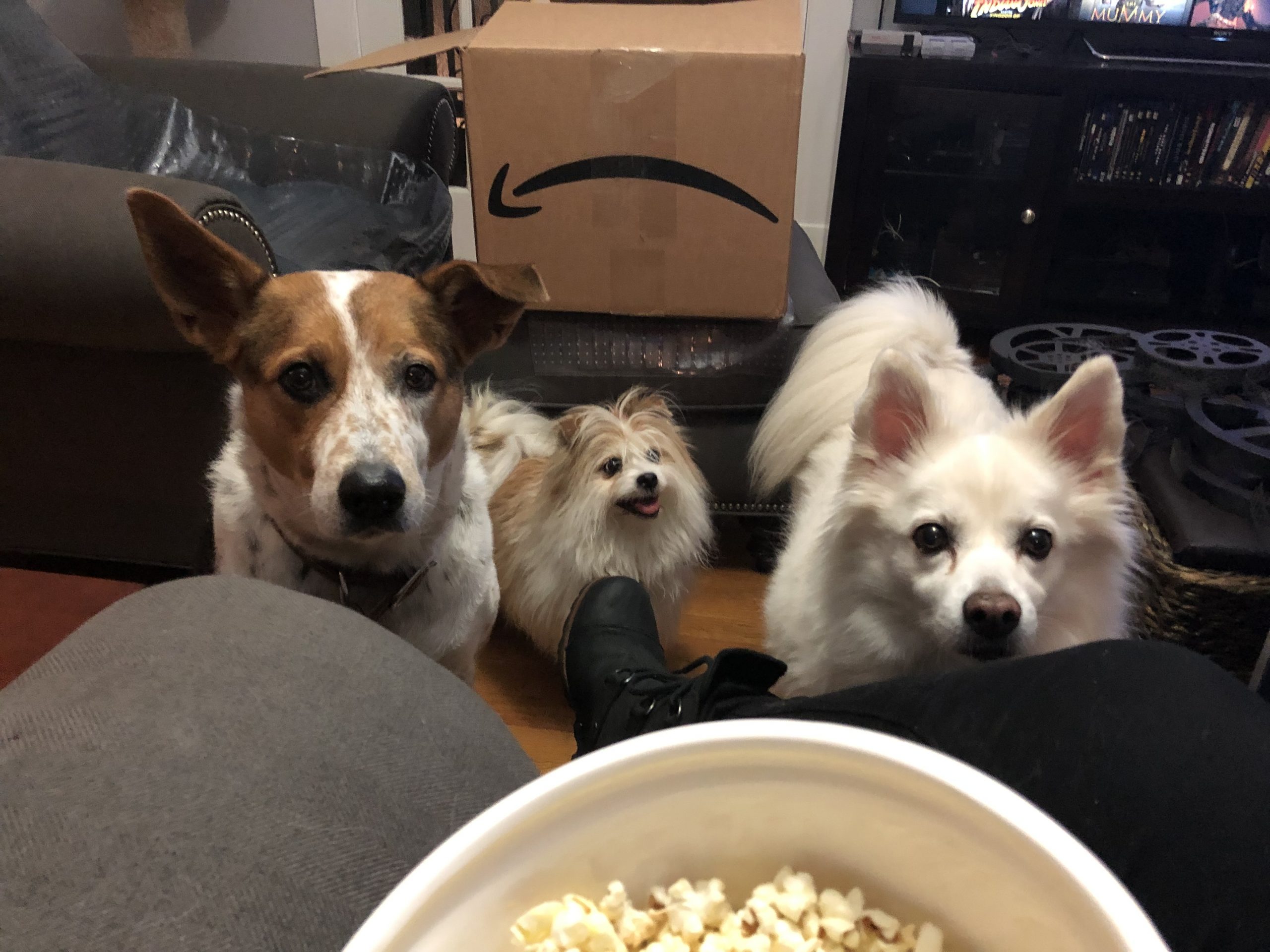 As I lay there trying to will my body to wake up, I wondered why Suki hadn’t barked to go out at her normal time. I got up to get some water and check on her. She didn’t hear me coming down the stairs but she was awake, and staring at the front door as if she was waiting for someone to burst through. She was hard of hearing in general at her age; but when she saw me walk by, she got up immediately, tail-wagging, and followed me towards the kitchen and back door. I let her out, which was quick this time. I gave her a gentle pat on the head and shared a favorite late-night snack, a few pieces of popcorn. She was happy.