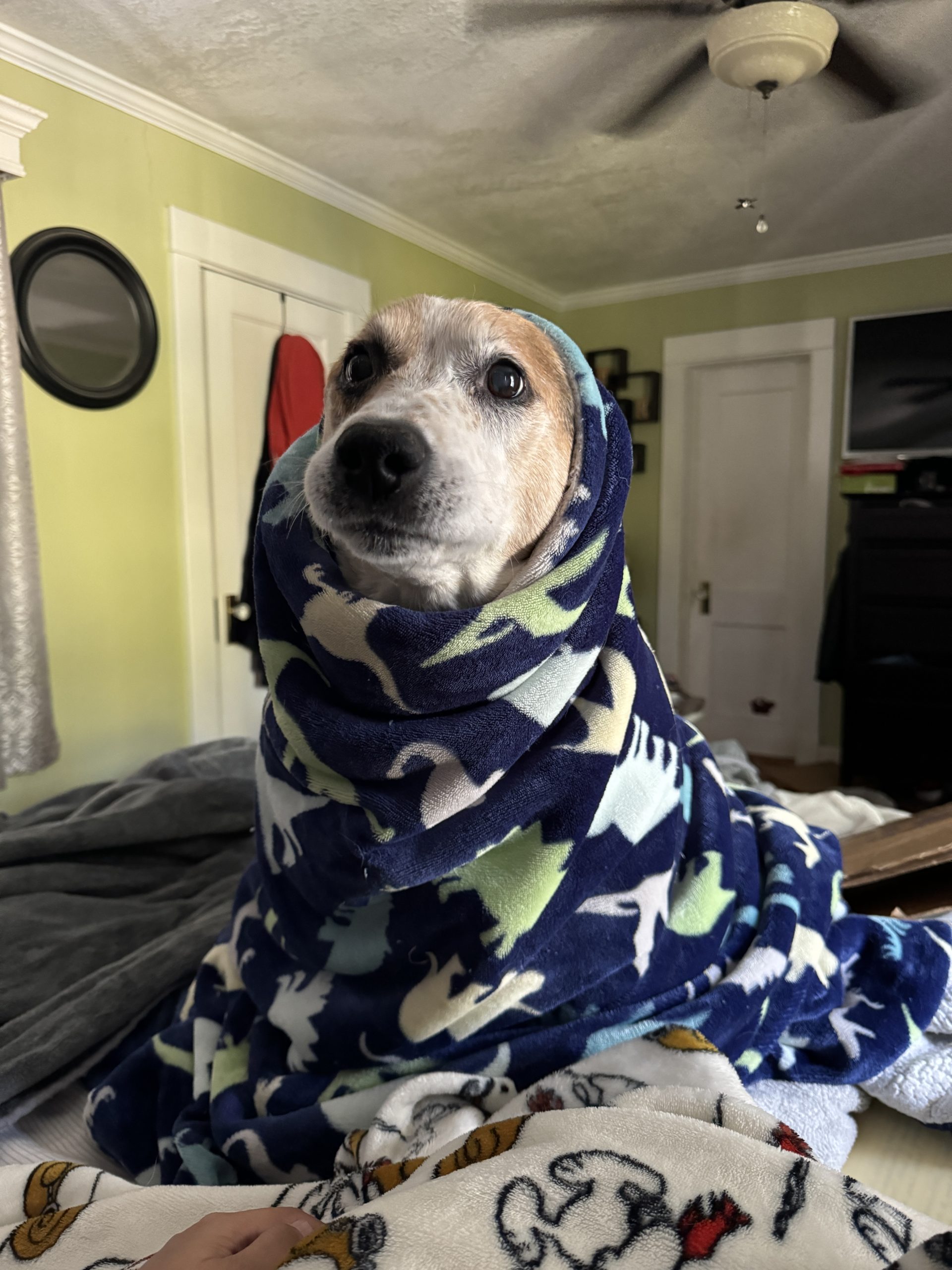 After I finished cleaning, I gently wrapped her in her favorite throw blankets, the ones she always slept on, and did my best to move her heavy body with care. But her body was stiff, she had passed hours ago. I wouldn’t be able to move her as-is so I looked around and found the biggest container near me. The dog toy box sat on the landing, usually so full, it was mostly empty today. My stomach churned slightly, but it was all I had nearby. I removed the last couple of toys and situated it nearby her body. I managed to get most of her 70lb frame inside of it and use it as leverage to carry her out to the car. The setup felt disturbingly makeshift for the gravity of the situation, but I couldn’t let the discomfort stop me, it was too important to keep going.